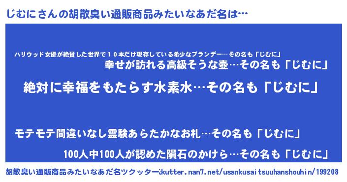 | 男性向けラノベタイトル風あだ名 | 『じむにという概念が存在しない退屈な世界 』 |