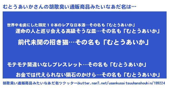 | 男性向けラノベタイトル風あだ名 | 『むとうあいか~年齢イコール彼女いない歴の魔法使い~』 |