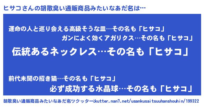 | 意味不明あだ名 | 『とにかく怪しいヒサコ』『自称ヒサコ』 |