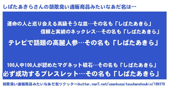 | 男性向けラノベタイトル風あだ名 | 『Re:しばたあきらから始める異世界生活』 |