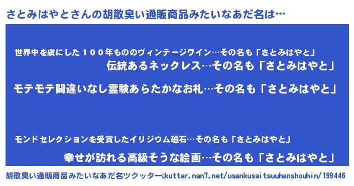 | 男性向けラノベタイトル風あだ名 | 『さとみはやとの憂鬱』 |