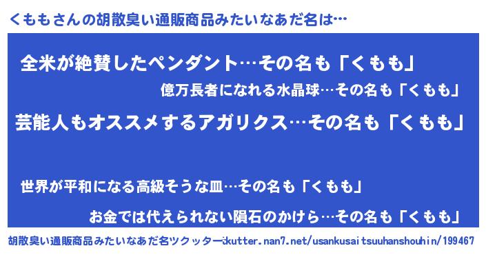 | 意味不明あだ名 | 『自称くもも』『とにかく怪しいくもも』 |