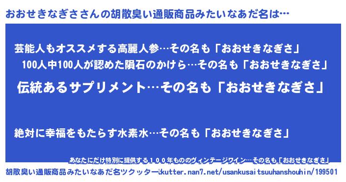 | 男性向けラノベタイトル風あだ名 | 『転生したらおおせきなぎさだった件』 |