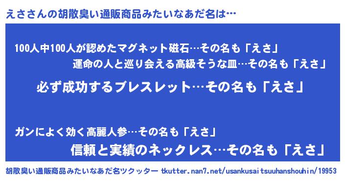 | ヒーロー風カッコイイあだ名 | 『スーパーエサ』『慈愛の使者えさ』 |