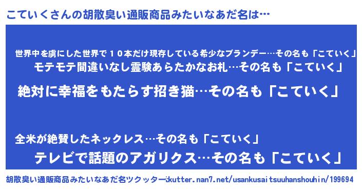 | 男性向けラノベタイトル風あだ名 | 『こていくという概念が存在しない退屈な世界 』 |