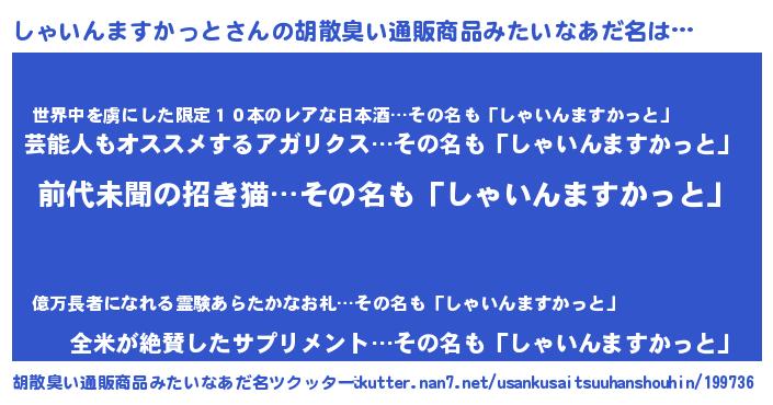 | ヘコむあだ名 | 『しゃいんますかっと(小並感)』『しゃっぺ』 |