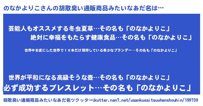 | 意味不明あだ名 | 『住所不定無職のなかよりこ(84歳)』 |