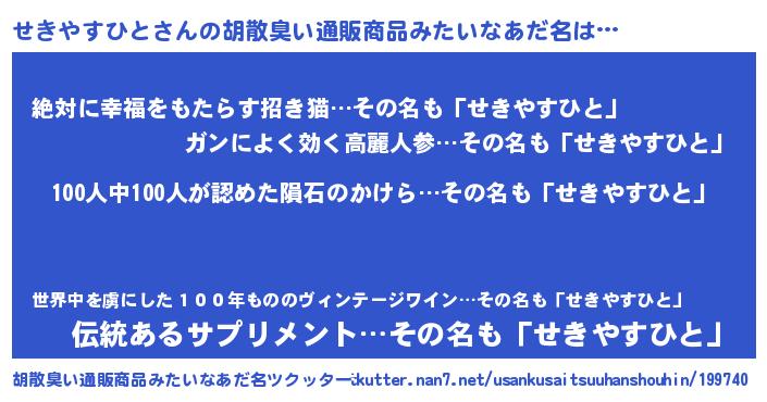 | ヘコむあだ名 | 『せきやすひと(苦笑)』『せき太郎』 |