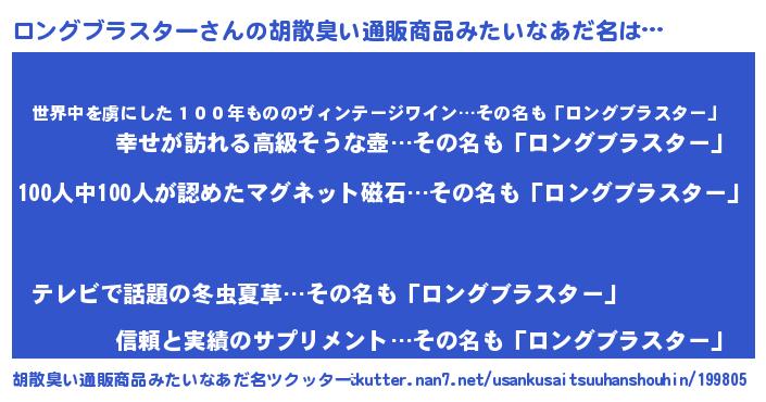 | 男性向けラノベタイトル風あだ名 | 『おまえをオタクにしてやるから、俺をロングブラスターにしてくれ! 』 |