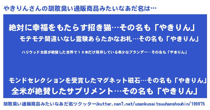 | 意味不明あだ名 | 『住所不定無職やきりん(98歳)』 |