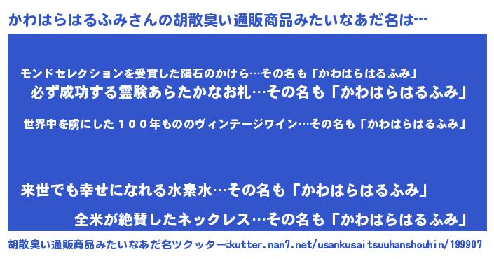 | 男性向けラノベタイトル風あだ名 | 『転生したらかわはらはるふみだった件』 |