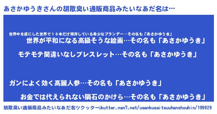 | 男性向けラノベタイトル風あだ名 | 『あさかゆうきの憂鬱』 |