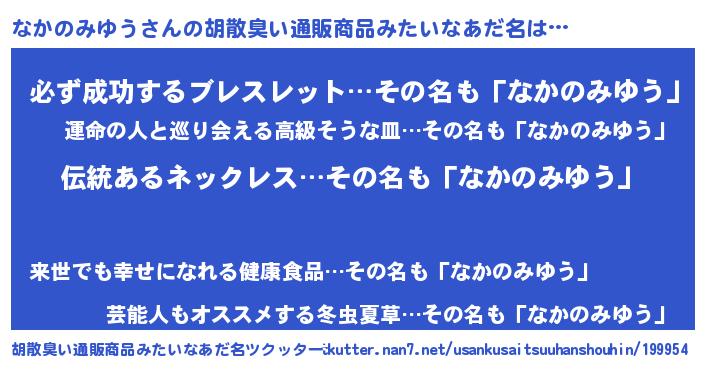 | 男性向けラノベタイトル風あだ名 | 『転生したらなかのみゆうだった件』 |