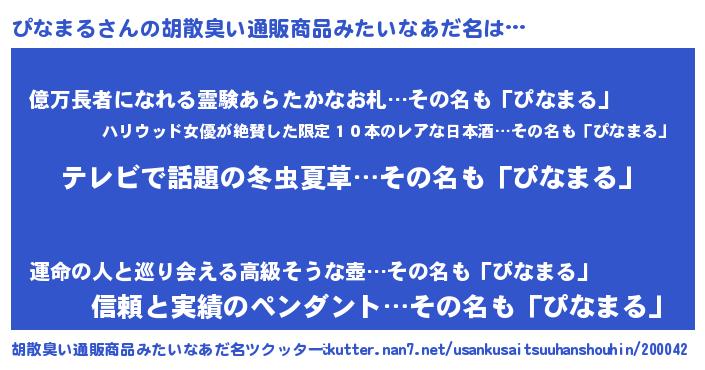 | 意味不明あだ名 | 『なめこ科ぴなまる属』『自称ぴなまる』 |