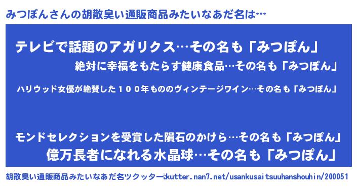 | 意味不明あだ名 | 『住所不定無職みつぽん(8歳)』 |