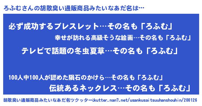 | 男性向けラノベタイトル風あだ名 | 『Re:ろふむから始める異世界生活』 |