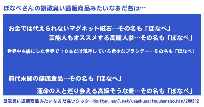 | ヒーロー風カッコイイあだ名 | 『仮面ボナダー』『正義の使者ぼなぺ』 |