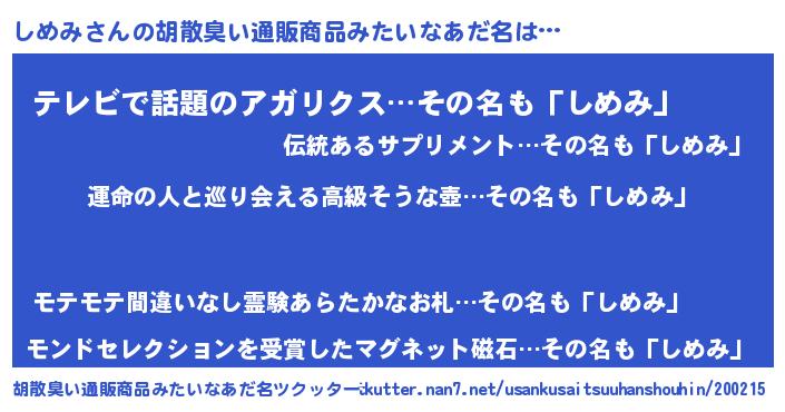 | 意味不明あだ名 | 『しめみフォーエバー』『自称しめみ』 |