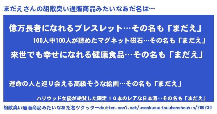 | ヘコむあだ名 | 『まだえ(苦笑)』『まだにー』 |