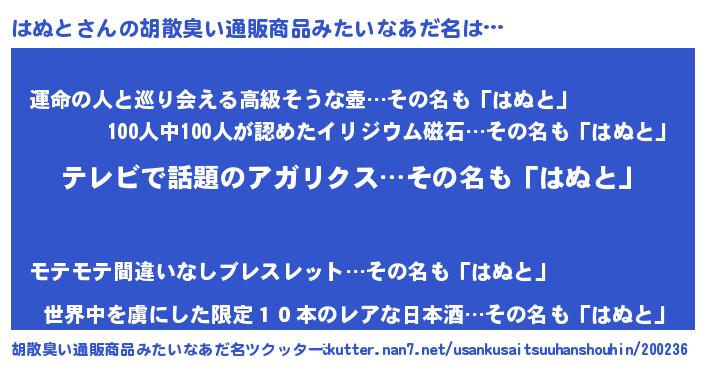 | ヘコむあだ名 | 『なまこ酢』『はぬにゅー』『はぬお』 |