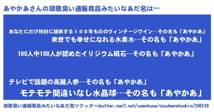 | ヘコむあだ名 | 『あやにゅー』『あやかあ(小並感)』 |