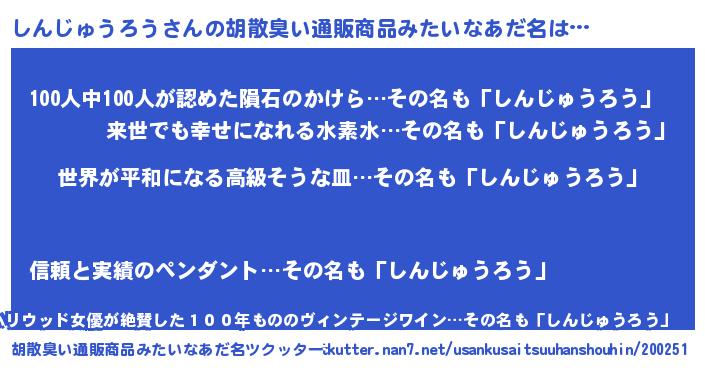 | 男性向けラノベタイトル風あだ名 | 『やはりしんじゅうろうの青春ラブコメはまちがっている 』 |