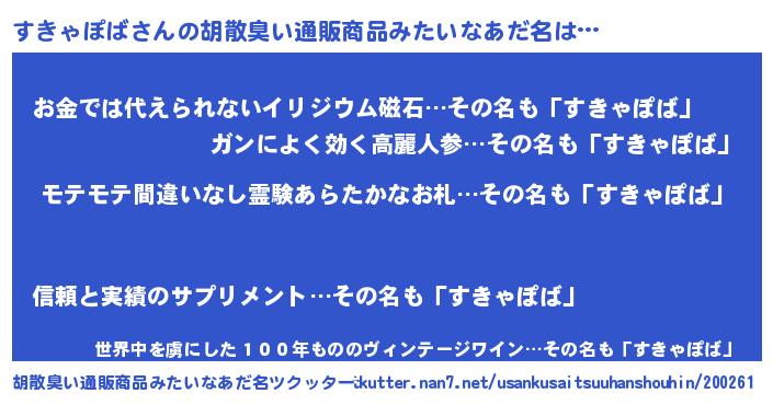 | 意味不明あだ名 | 『ペロリンすきゃぽば』『自称すきゃぽば』 |