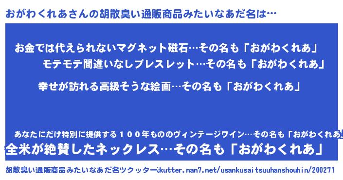 | 女子向けラノベタイトル風あだ名 | 『おがわくれあの雑貨屋さん』 |