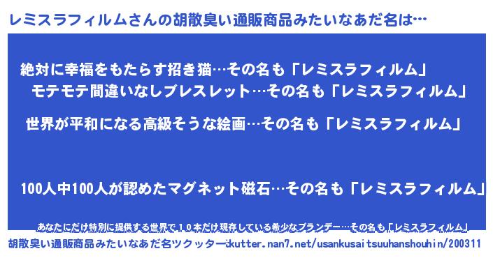 | 男性向けラノベタイトル風あだ名 | 『やはりレミスラフィルムの青春ラブコメはまちがっている 』 |