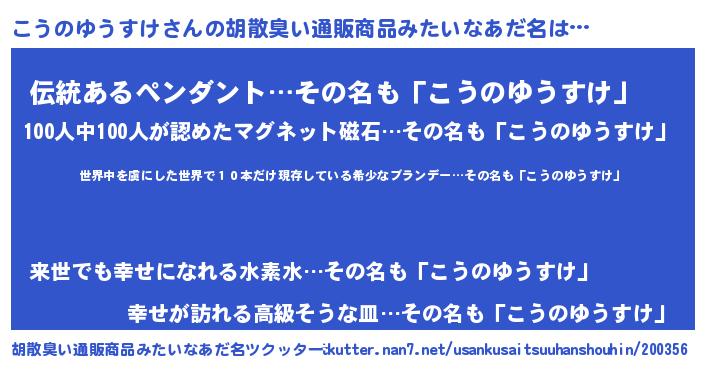 | 男性向けラノベタイトル風あだ名 | 『こうのゆうすけに滅ぼされるだけの簡単なお仕事です』 |