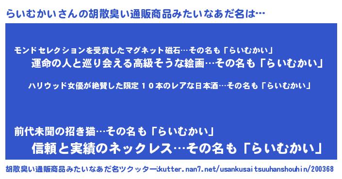 | ヘコむあだ名 | 『らいっぺ』『なまこ酢』『らいにー』 |