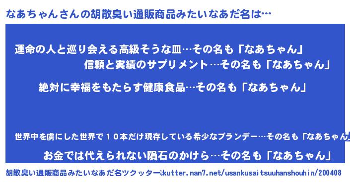 | 男性向けラノベタイトル風あだ名 | 『なあちゃんという概念が存在しない退屈な世界 』 |