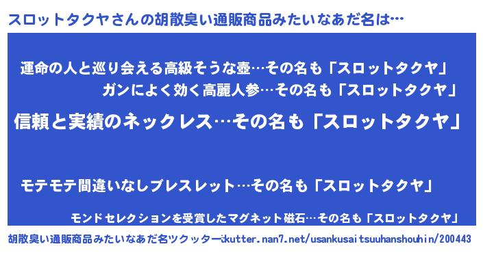| 男性向けラノベタイトル風あだ名 | 『ダンジョンにスロットタクヤを求めるのは間違っているだろうか』 |