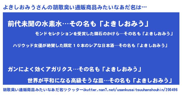 | ヘコむあだ名 | 『よきしおみう(爆)』『酢こんぶ』 |