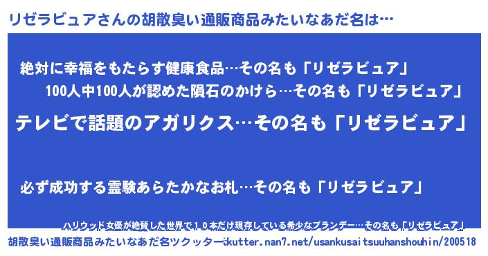 | 男性向けラノベタイトル風あだ名 | 『Re:リゼラビュアから始める異世界生活』 |