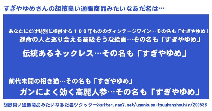 | 男性向けラノベタイトル風あだ名 | 『すぎやゆめの嫁は女の子じゃないと思った?』 |