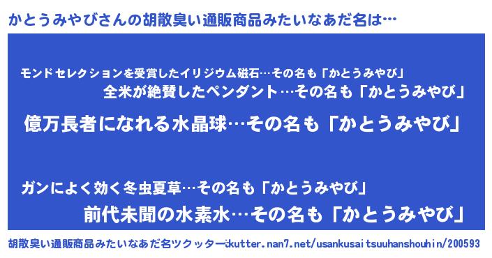 | 恥ずかしいあだ名 | 『プリティーかとうみやび』『かとちん』 |