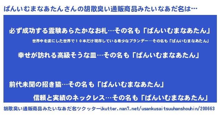 | 欧米人風あだ名 | 『ぱんいむまなあたんクリステル』 |