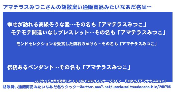 | 男性向けラノベタイトル風あだ名 | 『アマテラスみつこに滅ぼされるだけの簡単なお仕事です』 |