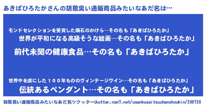 | ヘコむあだ名 | 『あきばひろたか(爆)』『あきっぺ』 |