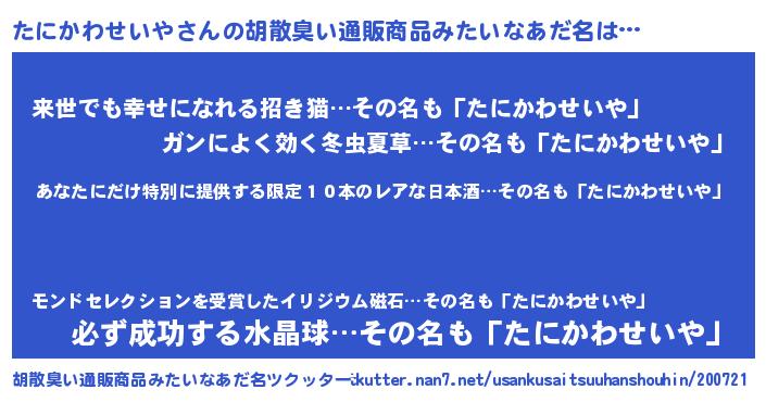 | 意味不明あだ名 | 『住所不定無職たにかわせいや(43歳)』 |