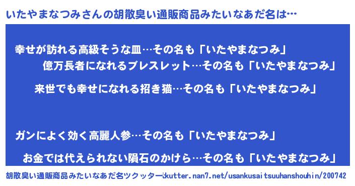| 男性向けラノベタイトル風あだ名 | 『転生したらいたやまなつみだった件』 |