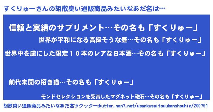 | 意味不明あだ名 | 『住所不定無職すくりゅー(39歳)』 |