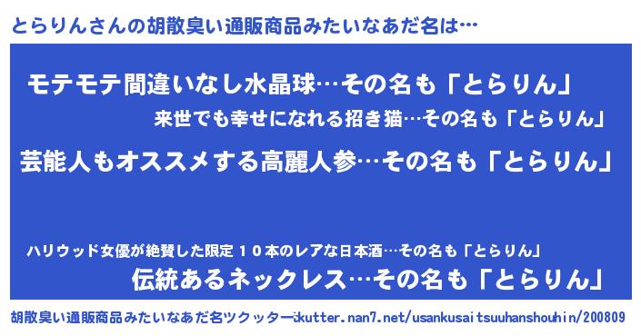 | 男性向けラノベタイトル風あだ名 | 『Re:とらりんから始める異世界生活』 |