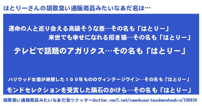 | 男性向けラノベタイトル風あだ名 | 『転生したらはとりーだった件』 |