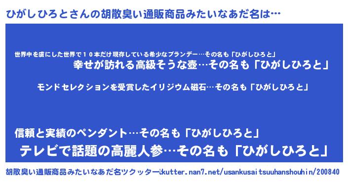| 男性向けラノベタイトル風あだ名 | 『ノーゲーム・ノーヒガシヒロト』 |