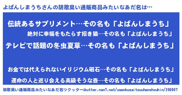 | 意味不明あだ名 | 『自称よばんしまうち』 |