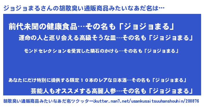 | 男性向けラノベタイトル風あだ名 | 『ジョジョまる~年齢イコール彼女いない歴の魔法使い~』 |