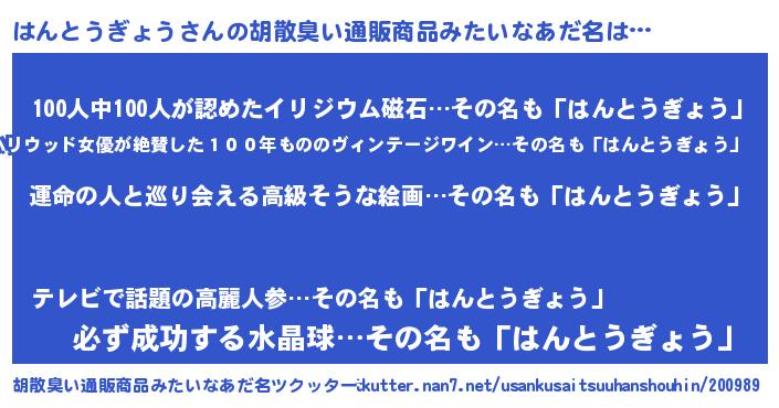 | 男性向けラノベタイトル風あだ名 | 『はんとうぎょう~年齢イコール彼女いない歴の魔法使い~』 |