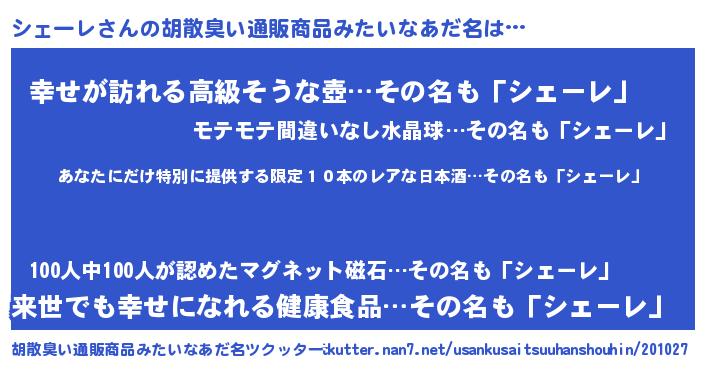 | 意味不明あだ名 | 『住所不定無職シェーレ(14歳)』 |